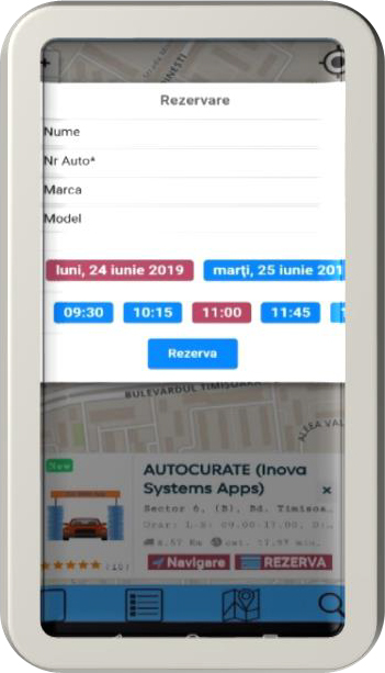 Butonul “Rezervă” deschide fereastra care permite realizarea unei progrămări la respectiva spălătorie sau centru de detailing auto.