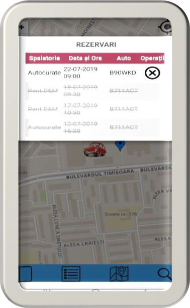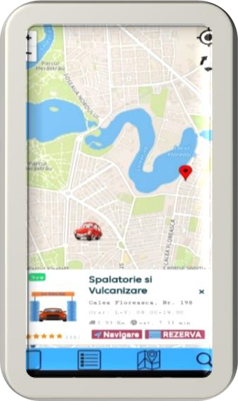 În partea de jos a ecranului apare o fereastă cu detaliile spălătoriei sau centrului de detailing auto selectat: denumire, adresa, orar, precum și distanța de la poziția utilizatorului, cat și timpul estimat de șofat până la locatia selectată.