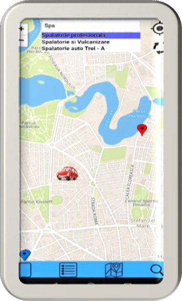 Căutarea este de tip dinamic: atunci când utilizatorul începe să scrie un cuvânt cheie (denumirea spălătoriei, adresa etc.), aplicația îi oferă mai multe rezultate relevante.