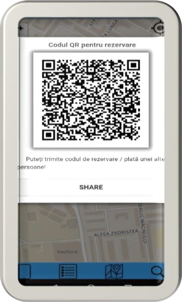 In momentul confirmarii rezervarii, aplicatia emite un cod QR unic ce poate fi transmis de catre titularul de cont si altor persoane.