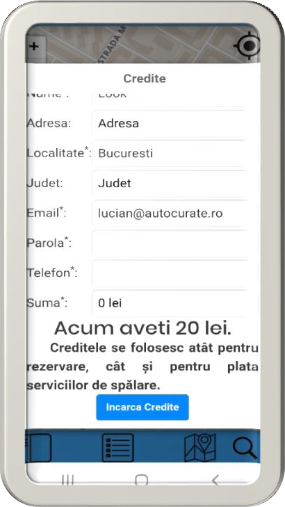 În cadrul secțiunii ”Credite” utlizatorul va putea să încarce, folosind un card bancar valabil, anumite sume de bani cu care să plătească rezervările viitoare sau serviciile prestate de catre spălătoriile sau centrele de detailing auto, direct din aplicație – prin scanarea codului QR aferent.