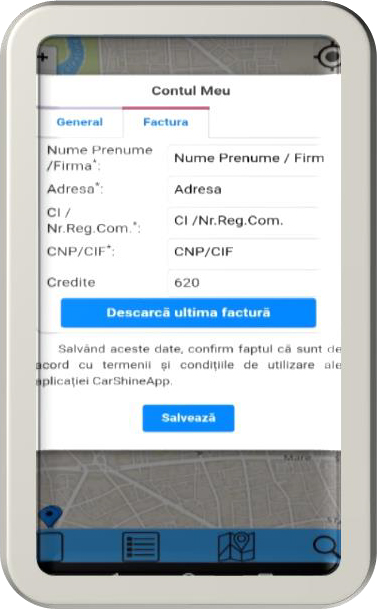 Secțiunea Factura îi permite utilizatorului titular de cont să obțină o factură fiscală de la administratorul aplicației CarShineApp, factura ce va include costurile aferente rezervărilor făcute, cat și pe cele ale serviciilor de splălare sau detailing auto ce au fost platite cu credite incarcate in aplicație, pentru luna anterioară.