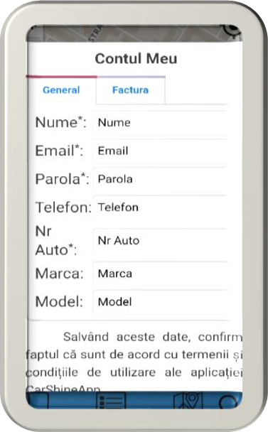 Datele cu care se completează câmpurile: nume, număr auto, modelul și marca autovehiculului vor fi preluate și înscrise automat în fereastra de rezervare la spălătorii sau centre de detailing auto. În fereastra de rezervare, aceste câmpuri se pot modifica, astel încât, titularul de cont, să poată face o rezervare și pentru o altă persoană / autovehicul.